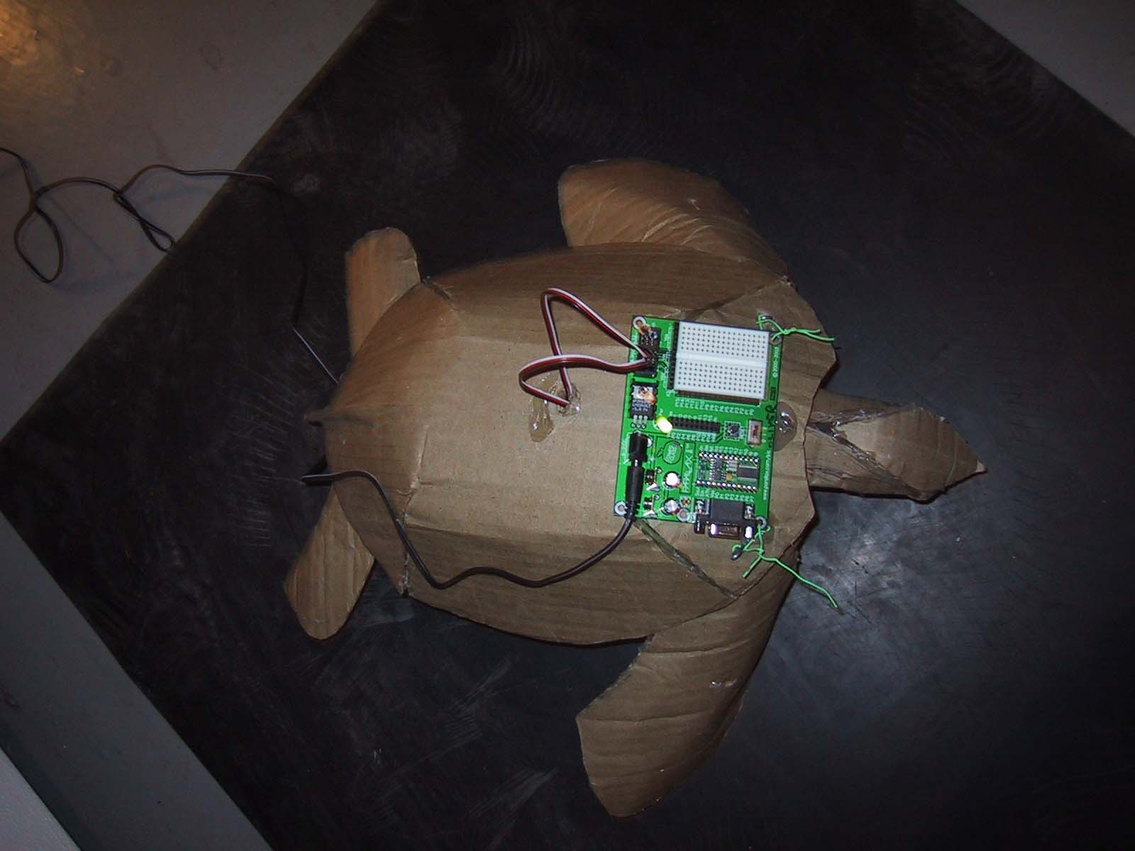 A few weeks back, I thought I would take a break from all of this seething consternation and learn how to build bots with my old pal Norm White. To my amazement, he hadn’t changed a bit since I saw him last over 20 years ago when I was just finishing up at the Ontario College of Art Back in those heady days, Norm and the rest of the Photo/Electric faculty inspired in us a deep love of hacking and coding. We were prepared to rip almost any piece of technology apart and subvert its functionality to our own bidding. At the UFO Workshop Norm introduced us to the intricacies of the Basic Stamp and other microcontrollers. With these tiny programmable brains, sculptures can be programmed to engage in complex movements and in effect become ‘sentient’ to their surroundings. I was able to cobble together a corrugated cardboard sea turtle which managed, with the help of its microcontroller and servos, to effect a kind of laborious egg-bound shuffle. Something about this little bot’s awkwardness and servitude to gravity, made me think I inadvertently captured some of the sad futility of the last of the living sea turtles, trying to haul their ancient carapaces up their last nesting beaches toward the orange electric glow of a hostile new millennium.