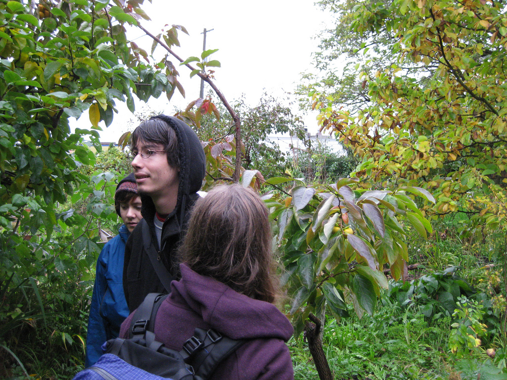 Anyway, back to the persimmons. When the Thistles and I trooped over to look at the plantings in Cottonwood, I was happy to see the persimmon trees bearing better than ever, their shiny leaved branches, bobbing in the November drizzle with jaunty orange fruits. For those of you who have never eaten a persimmon, some caution is in order. Fuyu, type persimmons taste sweet even when not completely ripe but many others, such as the popular Hachiya, need to be quite soft before you eat them, otherwise your mouth will feel like you’ve just sucked on a deodorant stick, – a saliva-less gaping hole through which you will have to beg for water. Well not quite that bad, but the fruit-fancier’s description of ‘astringent’ is well worth noting. When sufficiently ripened though, these persimmons are sheer ambrosia. Though native to the Far East, these ‘kaki’ type persimmons (Diospyros kaki), have a long history of cultivation in the Mediterranean. Over the years, I’ve noticed quite a few of these trees popping up in East Vancouver, usually in the yards of Italian immigrants, and many of them seem to be producing well. Given the right location and a bit of care, Asian persimmons should thrive in at least the mildest parts of Canada. The related American persimmon (Diospyros virginiana) is native to areas not that far south of the Great Lakes and can stand quite a bit of cold. Clearly some experimentation is in order. Grimo Nut Nursery offers some varieties they say do well in Southern Ontario, which might be worth a try in other mild-ish areas as well.