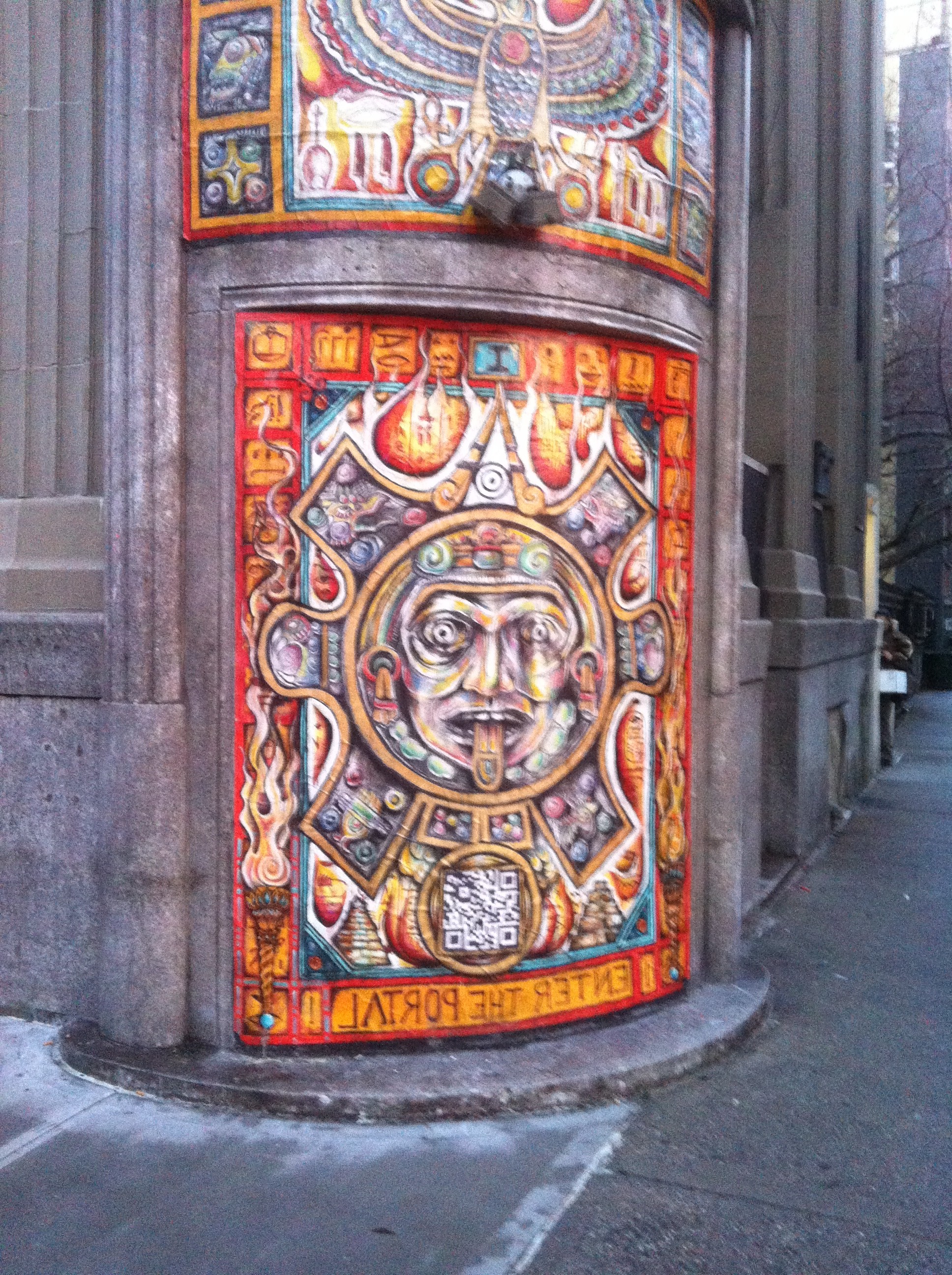 It’s the last day before the NYU students’ Christmas break and the streets of the East Village are full of drunken Santas and inebriated elves vomiting, fighting and staggering into traffic. For some reason this makes me very happy – a debauched anti-Christmas that serves to de-alienate me from the saccharine strains of seasonal Muzak and ersatz bonhomie that are so hard to get away from at this time of year. In keeping with the looming end of the Mayan calendar, a young hipster is getting his picture taken next to the Meso-American themed ‘portal’ he has pasted onto the old bank building on the corner, complete with the now obligatory QR code to link our smartphones to his on-line brand. And he is looking mighty pleased with himself. Sadly, the real Armageddon turns out to be a much slower, more painful, affair, which we’ll have to spend many more years enduring, despite all the prophesying and anticipatory hippie dancing down there in the Yucatan. A day after the anticipated end of the world, the ‘portal’ is already peeling-  its wheat paste no match for the dampness of the winter weather.
